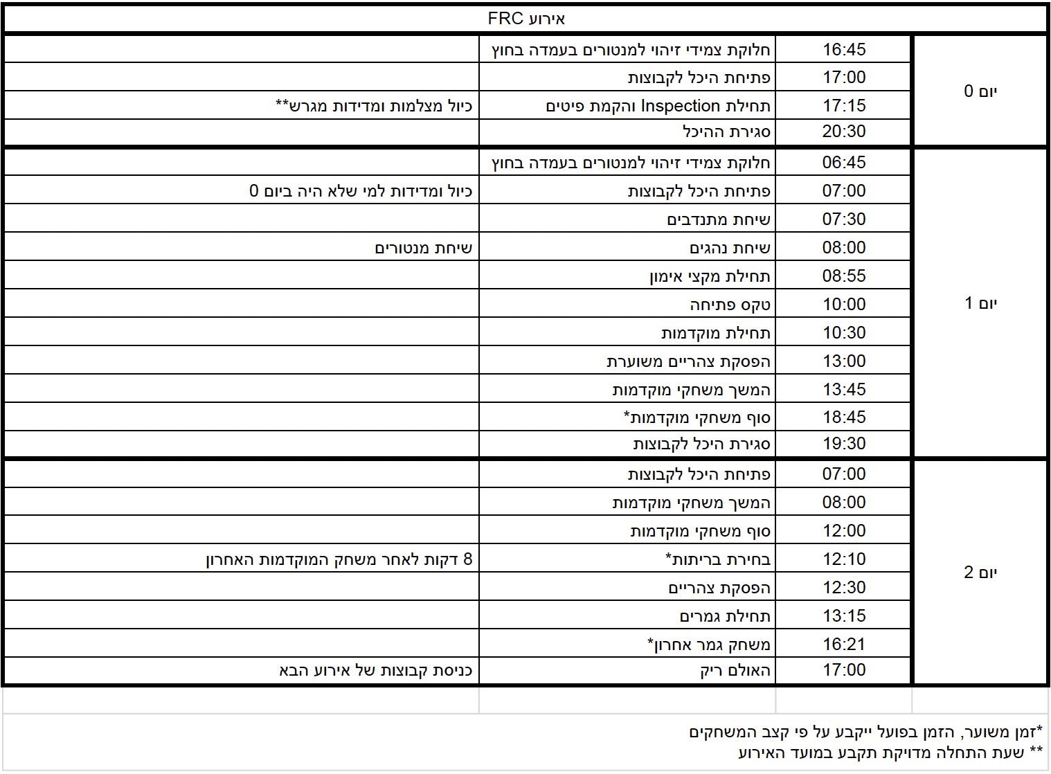 מצורף לוח זמנים לתחרויות. שימו לב, כחלק מהפקת הלקחים בנוגע לכניסת קהל להיכל, השנה חלוקת צמידים למנטורים תתבצע בחוץ/ממש בכניסה להיכל ע"פ הנחיות הבטיחות, על מנת לאפשר כניסה להיכל לפני זיהוי המשתתפים, לצד כניסה בטוחה ומסודרת. מפת ההיכל, מיקום הפיטים, אינספקשין ומגרש אימונים יפורסם לקראת התחרות כמו כן - כפי שעשינו בשנה שעברה, יינתן זמן לכיול מצלמות ומדידות במגרש כבר בערב ההקמה.